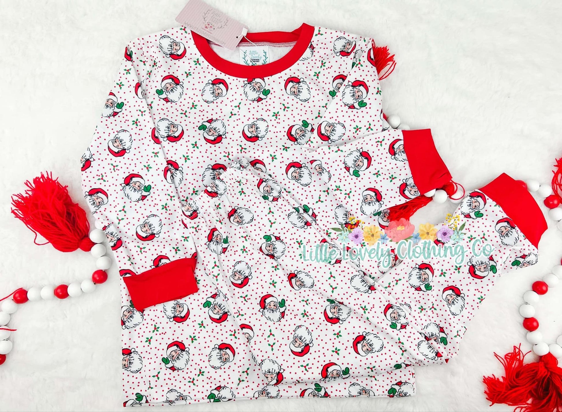 Get ready for the holidays with our Polka Dot Santa Lounge! This soft and cute lounge features a fun polka dot pattern, perfect for adding a touch of festive charm to your loungewear. Relax in style and comfort this season with our Santa-inspired lounge.